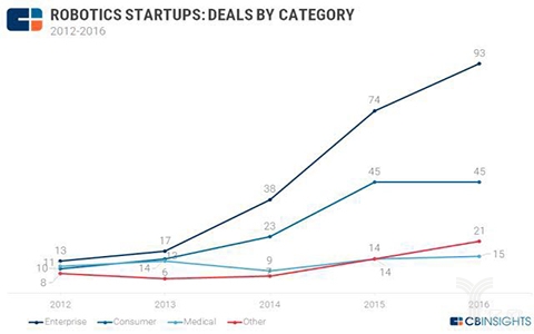 从下面的折线图就能够看出,这部门增加大多来自企业使用机械人,好比工业从动化、最初一公里物流。2015年,企业部门的投资案件有74起,较上一年增加95%;2016年,这部门是93起。面向消费者的机械人部门正在2016年和2015年都有44起投资,可是较2014年有96%的增加。